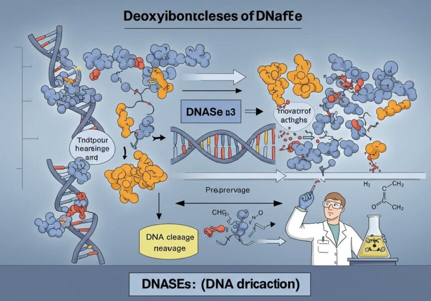 A dezoxiribonukleázok olyan enzimek, amelyek a dezoxiribonukleinsav (DNS) molekuláinak foszfodiészter kötéseit hidrolitikusan hasítják. Ez a folyamat a DNS-lánc kisebb egységekre, oligonukleotidokra vagy mononukleotidokra való fragmentálódásához vezet. Működésük alapvető fontosságú a sejtek számára, hiszen lehetővé teszi a hibás vagy felesleges DNS eltávolítását, a genetikai anyag újrarendeződését és a programozott sejthalál során a DNS kontrollált lebontását. Az enzimatikus reakció során a vízmolekula betör a foszfodiészter kötésbe, felhasítva azt, és így egy szabad hidroxil- és egy foszfátcsoportot hoz létre a DNS-gerincen.