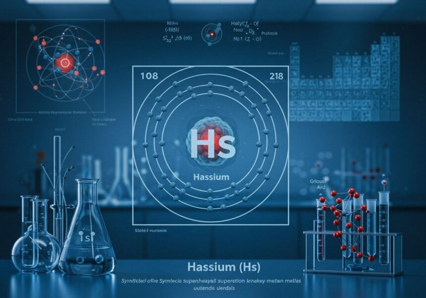A hassium (Hs) a periódusos rendszer 108-as rendszámú eleme, ami azt jelenti, hogy atommagja 108 protont tartalmaz. A 7. periódusban, a 8. csoportban található, így a d-blokk elemek közé tartozik, és az átmenetifémek családjának része. Elméleti szempontból az ozmium (Os) nehezebb homológjának, az úgynevezett eka-ozmiumnak tekinthető. Ez a besorolás alapvető támpontot adhat a kémiai tulajdonságainak előrejelzéséhez, bár a szupernehéz elemek esetében a relativisztikus hatások jelentősen módosíthatják a várakozásokat.