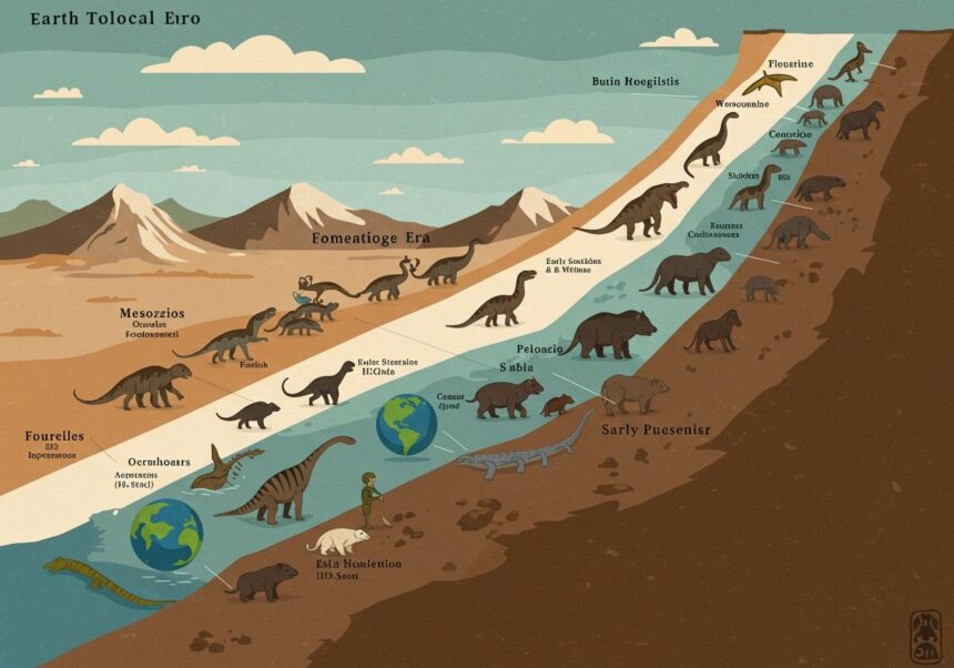 - Mezozoikum (középidő): A „középső élet” kora, dinoszauruszok virágkora.
